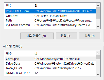약간의 차이점이 있었다면, 일반적으로 자바를 설치 시에 사용자변수에 환경변수를 추가 후 시스템변수에서