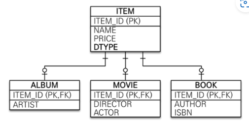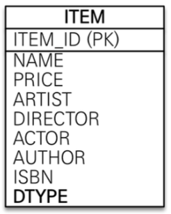 즉, 부모 테이블의 컬럼들과 자식 테이블의 컬럼들이 모두 한 공간에 있기 때문에, 자식 테이블 끼리 서로 구별할 수 있는 DTYPE이 반드시 필요하다.