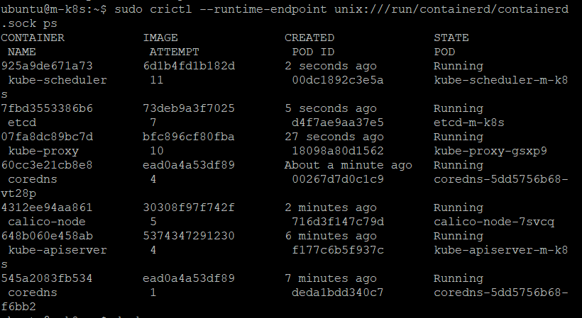 sudo crictl --runtime-endpoint unix:///run/containerd/containerd.sock ps