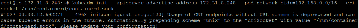 kubeadm init --apiserver-advertise-address [private ip] --pod-network-cidr=192.168.0.0/16 --cri-socket /run/containerd/containerd.sock