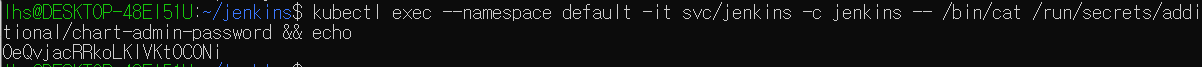 kubectl exec --namespace default -it svc/jenkins -c jenkins -- /bin/cat /run/secrets/additional/chart-admin-password && echo
