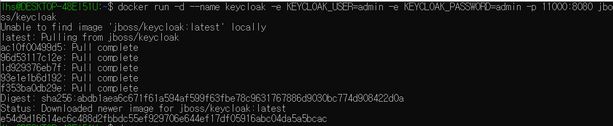 docker run -d --name keycloak -e KEYCLOAK_USER=admin -e KEYCLOAK_PASSWORD=admin -p 11000:8080 jboss/keycloak