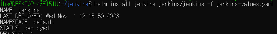 helm install jenkins jenkins/jenkins -f jenkins-values.yaml